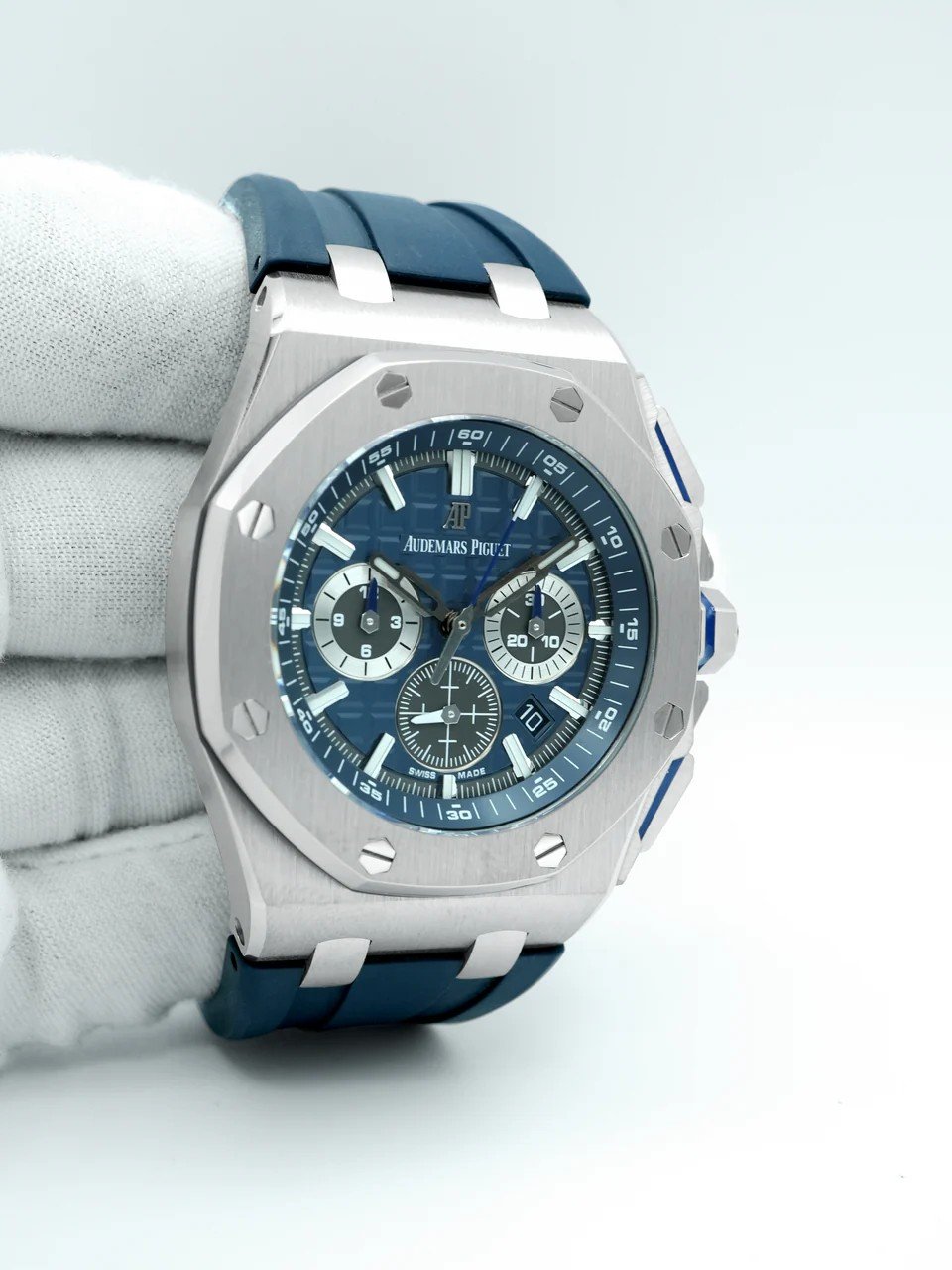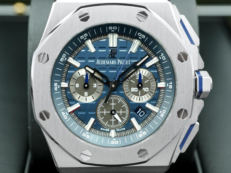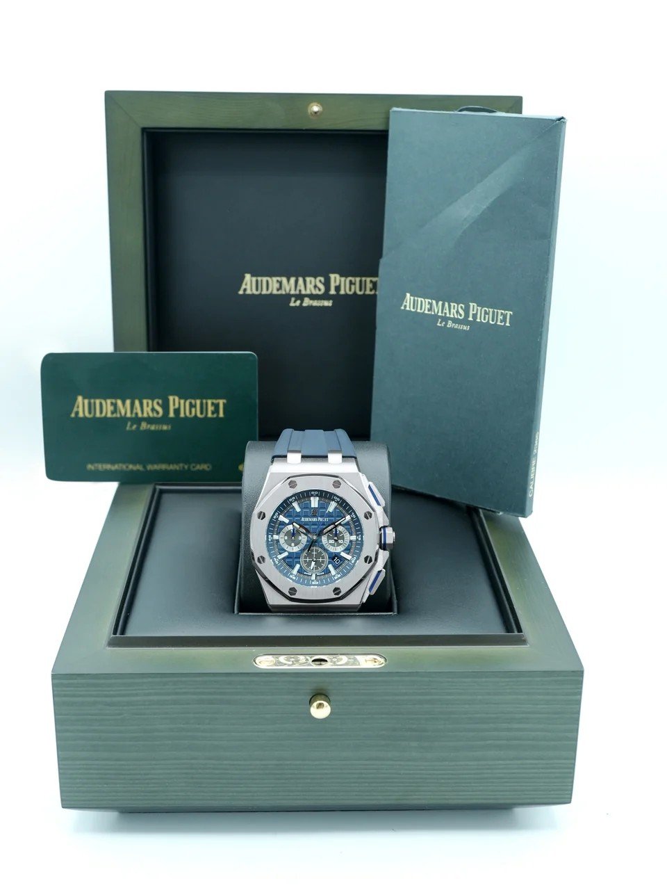 Audemars Piguet Royal Oak Offshore 42 mm ref. 26480TI.OO.A027CA.01 features a bold blue dial, titanium case, and matching blue rubber strap for a sport-luxury statement. This complete set is 100 % authentic and expert verified, includes the original Audemars Piguet box and papers, and ships with free insured shipping.