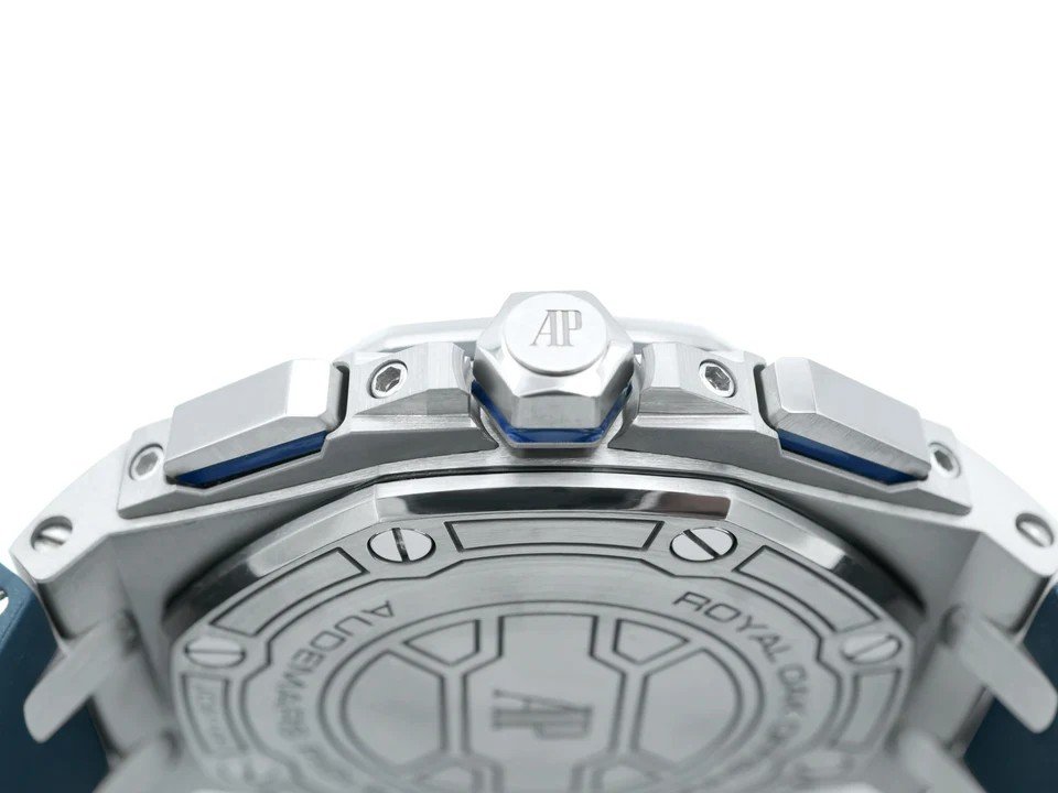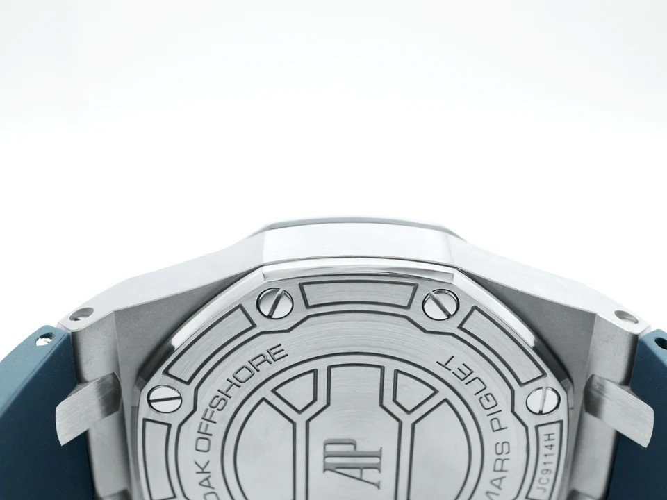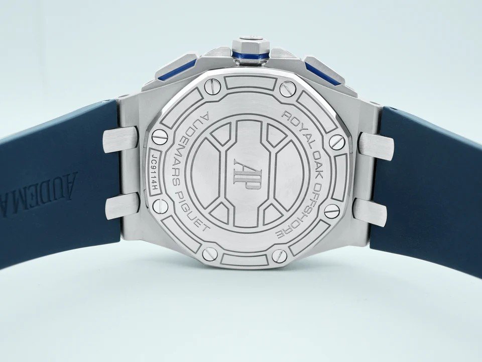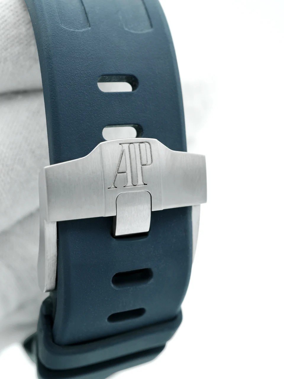 Audemars Piguet Royal Oak Offshore 42 mm ref. 26480TI.OO.A027CA.01 features a bold blue dial, titanium case, and matching blue rubber strap for a sport-luxury statement. This complete set is 100 % authentic and expert verified, includes the original Audemars Piguet box and papers, and ships with free insured shipping.