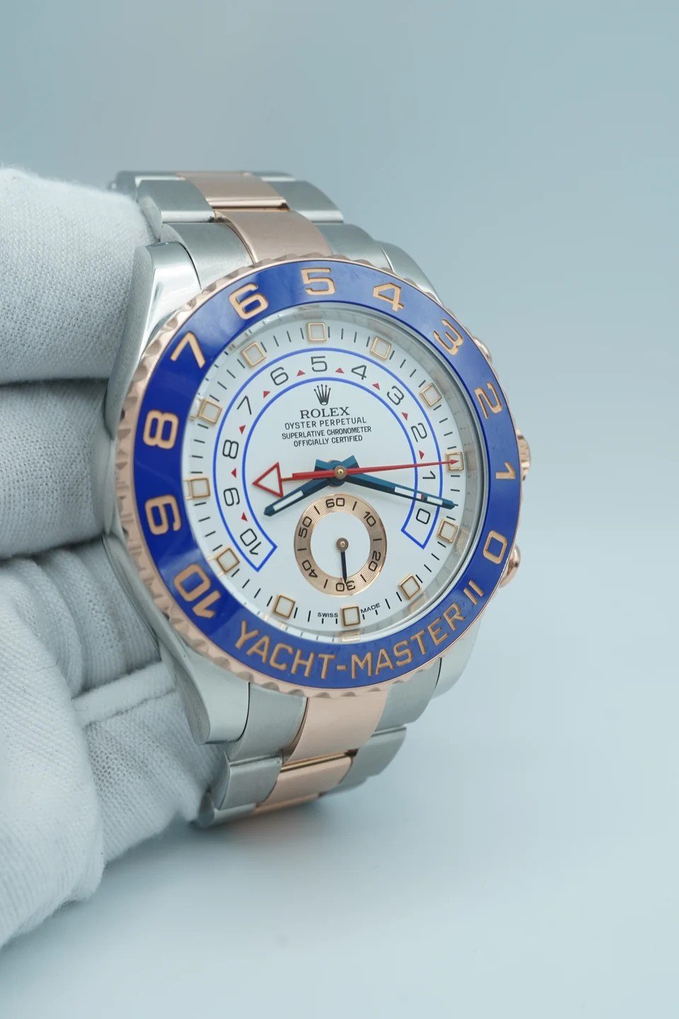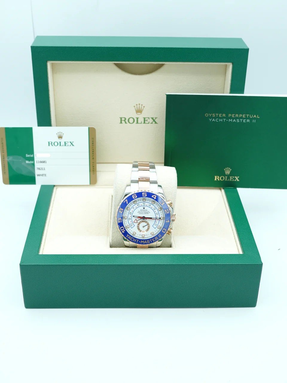 Rolex Yacht-Master II 44 mm ref. 116681 features a white dial, blue ceramic bezel, and two-tone stainless steel and 18K Everose gold Oyster bracelet. Designed for regatta timing, this complete set is 100 % authentic and expert verified, includes the original Rolex box and papers, and ships with free insured shipping.