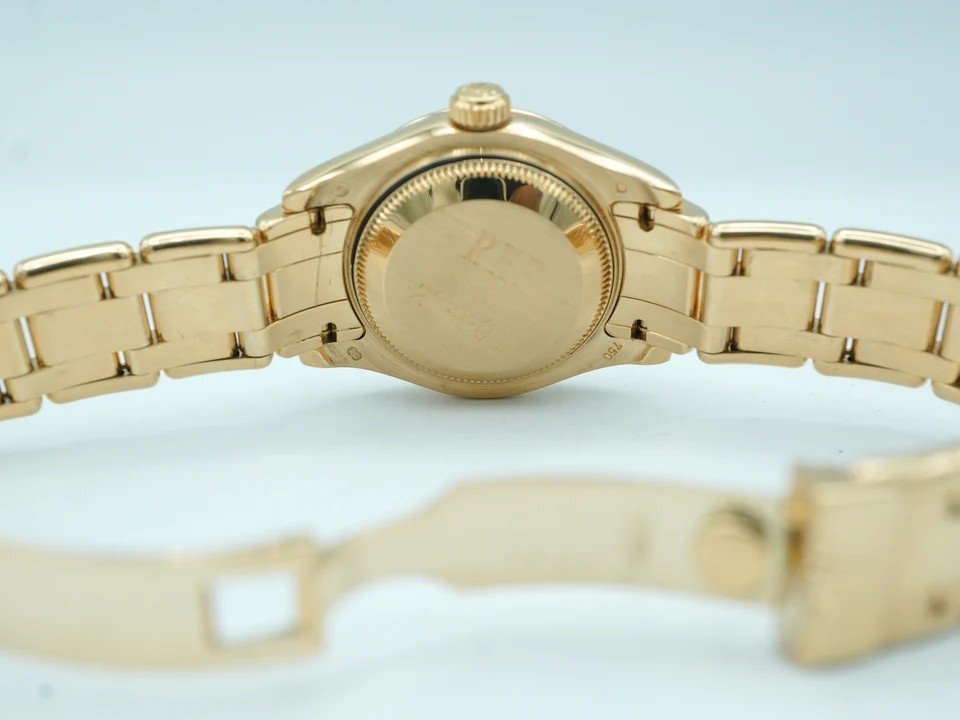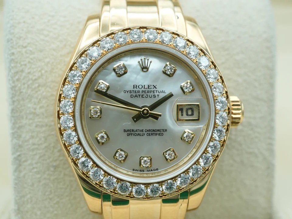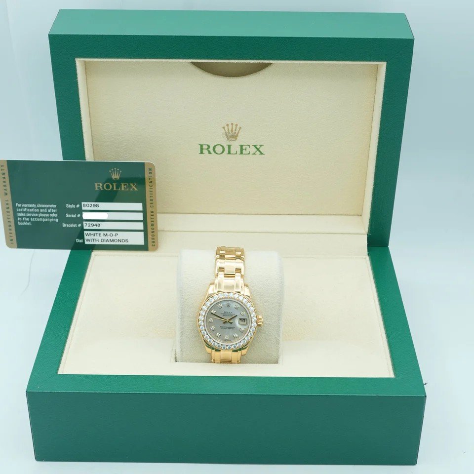 This Rolex Lady-Datejust Pearlmaster is pre-owned in 9/10 very good condition and comes with its original Rolex box, Datejust manual, and warranty papers as shown in the pictures attached. This watch is in stock and available to ship immediately with free insured shipping.